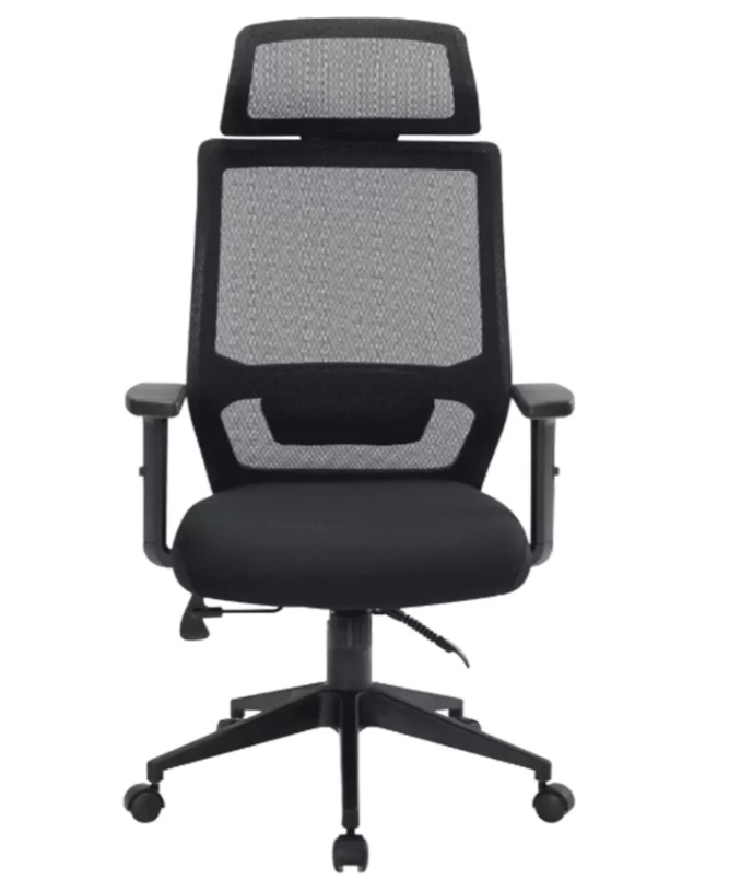 Cadeira Genebra Presidente, Regulagem de altura do assento | Regulagem de altura dos braços | Assento com espuma injetada | Regulagem da inclinação do encosto | Sistema sincronizado (travamento do encosto em qualquer posição) | Apoio de lombar | Apoio de cabeça fixa | Ergonômica – Certificação NR 17
